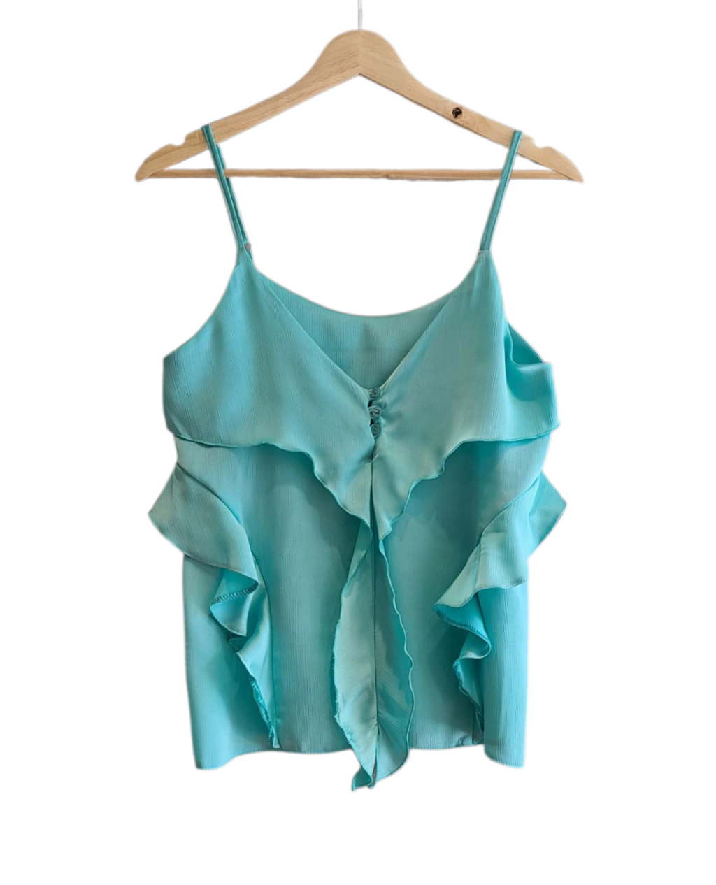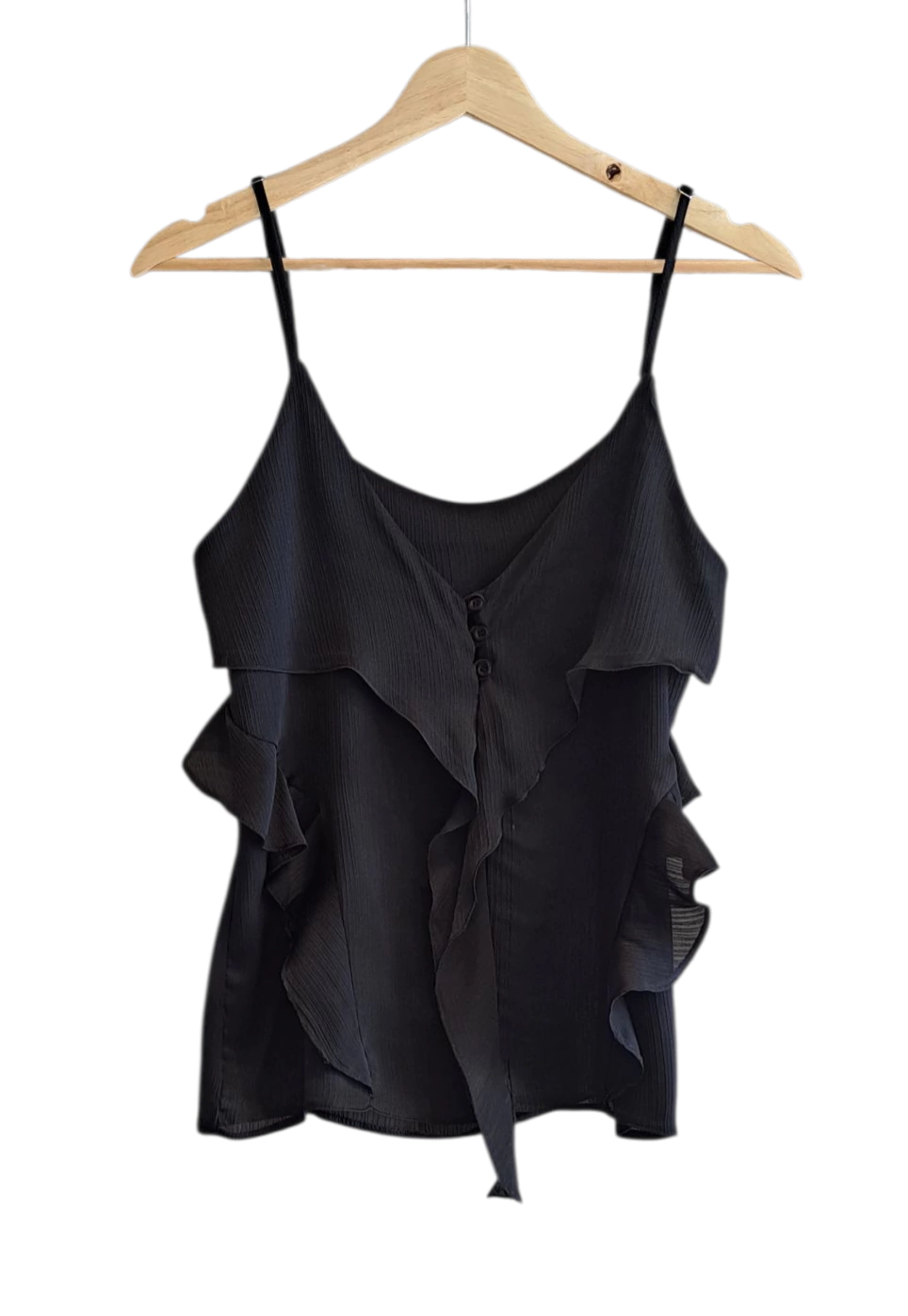 Descubrí la elegancia y frescura de esta musculosa confeccionada en silk, ideal para los días de calor. Sus finos breteles y los botones frontales aportan un detalle delicado y sofisticado. Los volados en cascada realzan el diseño, brindando movimiento y estilo único a tu look. Perfecta para combinar con prendas tanto casuales como formales.